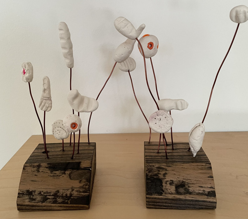 Found, stained wood, hand-made beads, embedded beads, wire. Each work is 3"W x 8"H x 3"D. 2025. Must be purchased as set.