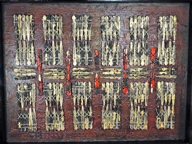 Deconstructed painted clothes pins, guilded on wood panel with hand made paper, painted, hemp thread, gold thread,  24 x 16, 2014