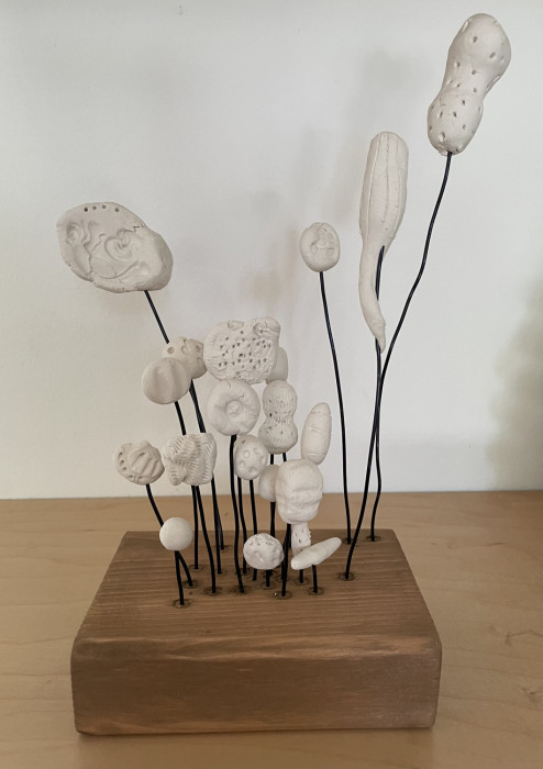 Stained wood, hand-made clay beads, wire. 5"W x 10"H x 3.5"D. 2025.